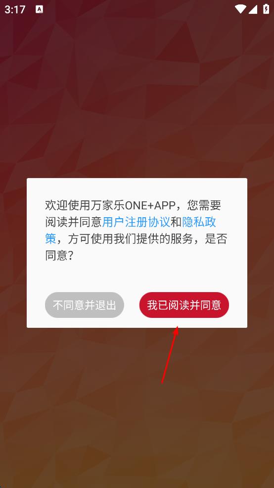 1、打开万家乐ONE+APP,在弹出的用户注册协议和隐私政策提示框中,点击我已阅读并同意。