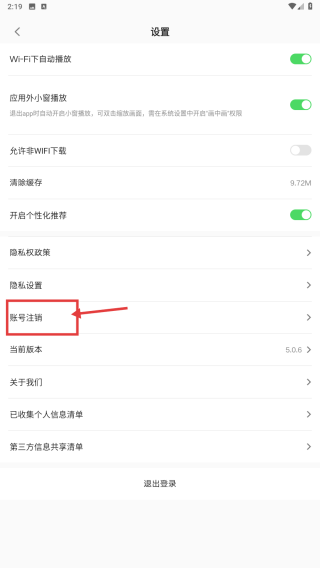 3、在设置页面,点击账号注销选项,进入注销须知界面。