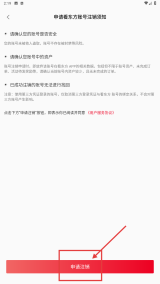 4、在注销须知界面,点击申请注销按钮,发起账号注销操作。