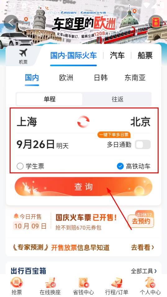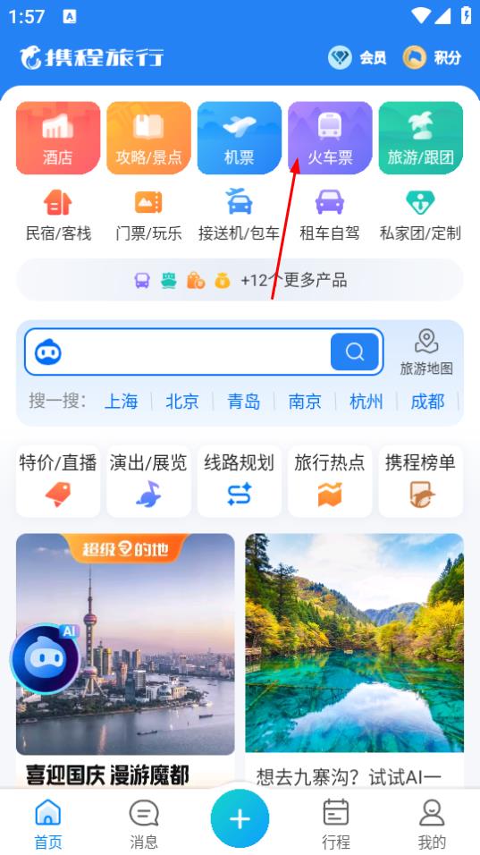 1、打开携程旅行,点击火车票,进入火车票预订页面。
