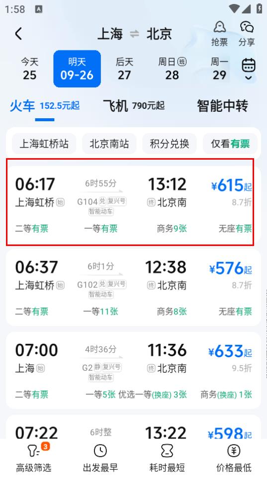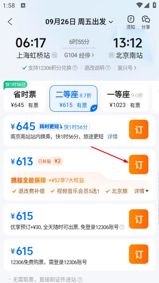 4、在车票预订页面,选择合适的票价选项,点击订完成买票操作。