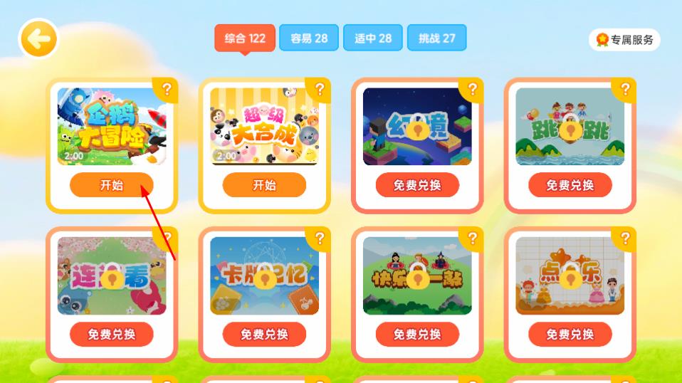 3、在训练游戏选择页面,点击企鹅大冒险下方的开始,进入训练前准备页面。