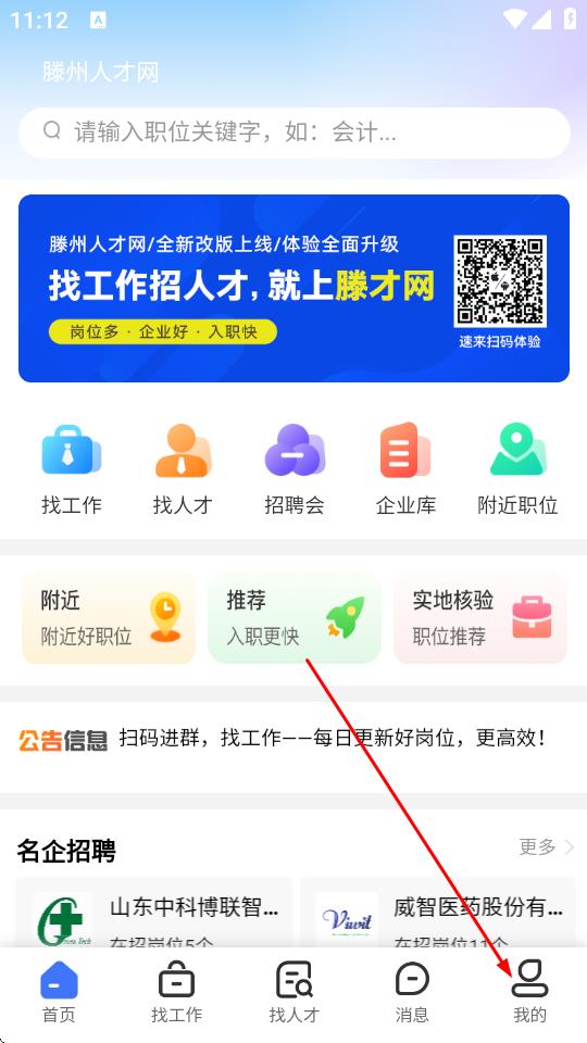 1、打开滕州人才网APP,点击底部导航栏中的我的。
