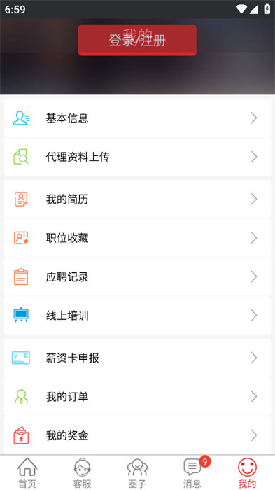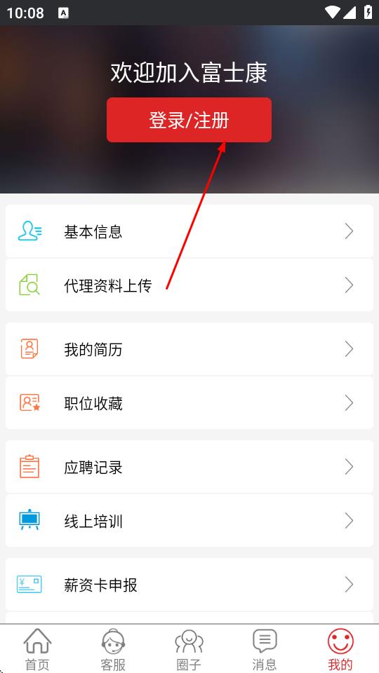 2、在我的页面,点击登录/注册按钮。