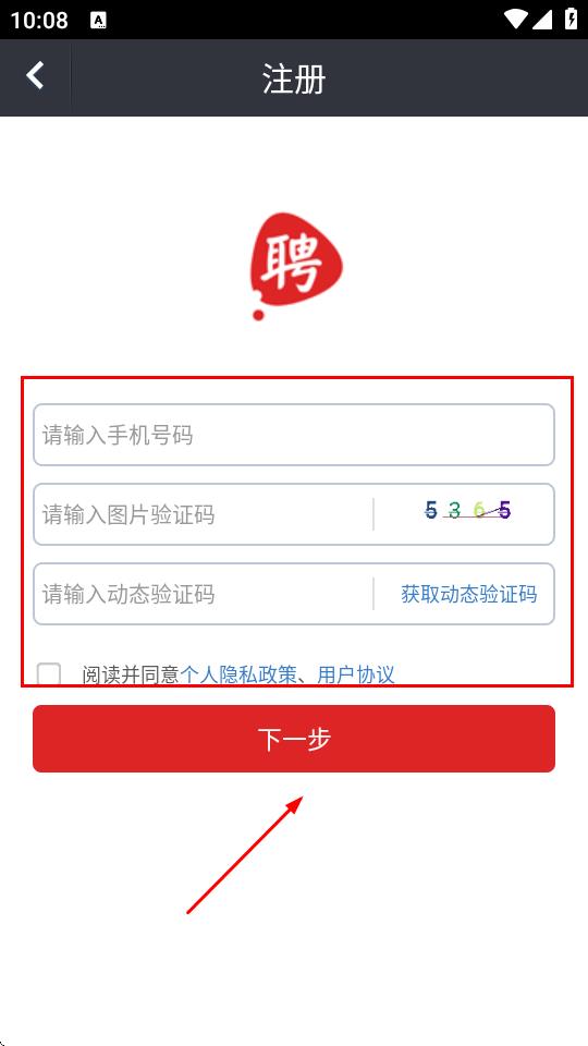 4、在注册页面,输入手机号码、图片验证码,输入动态验证码,勾选同意个人隐私政策和用户协议,点击下一步。
