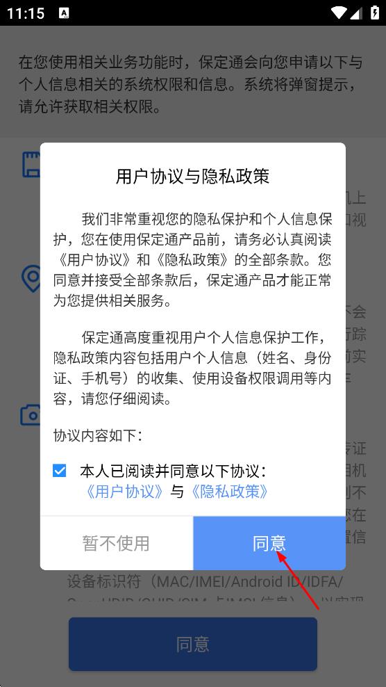 1、打开保定通App,在弹出的用户协议与隐私政策页面,点击“同意”按钮。
