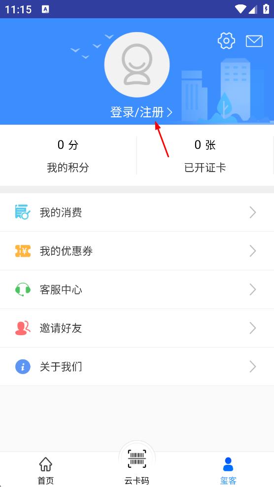 3、在“玺客”页面,点击上方的“登录/注册”区域。