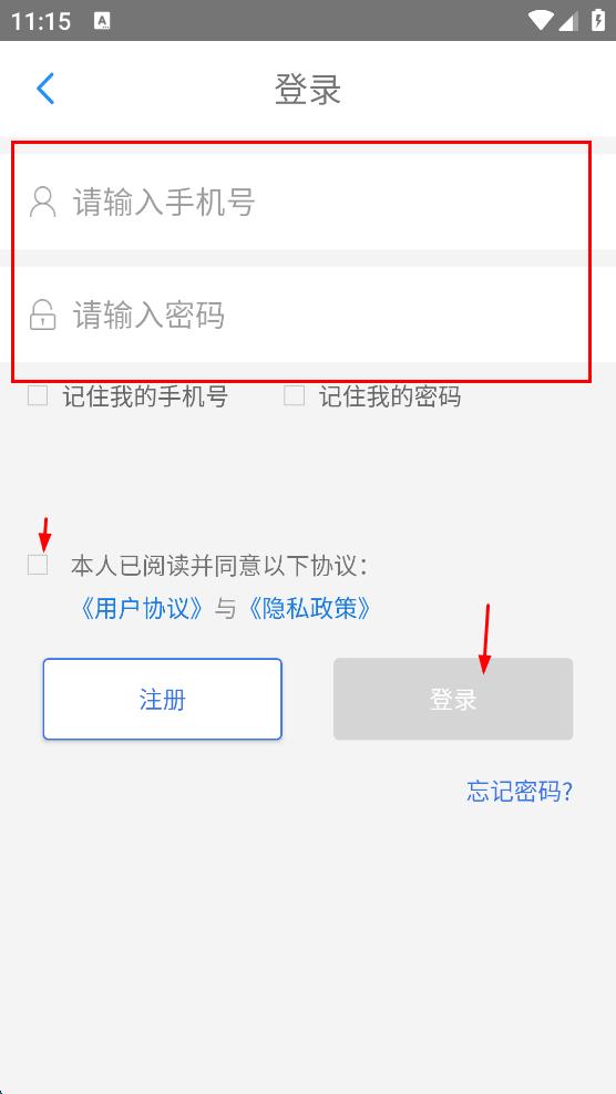 4、进入登录页面,输入手机号和密码,勾选“本人已阅读并同意以下协议,用户协议与隐私政策,点击“登录”按钮。