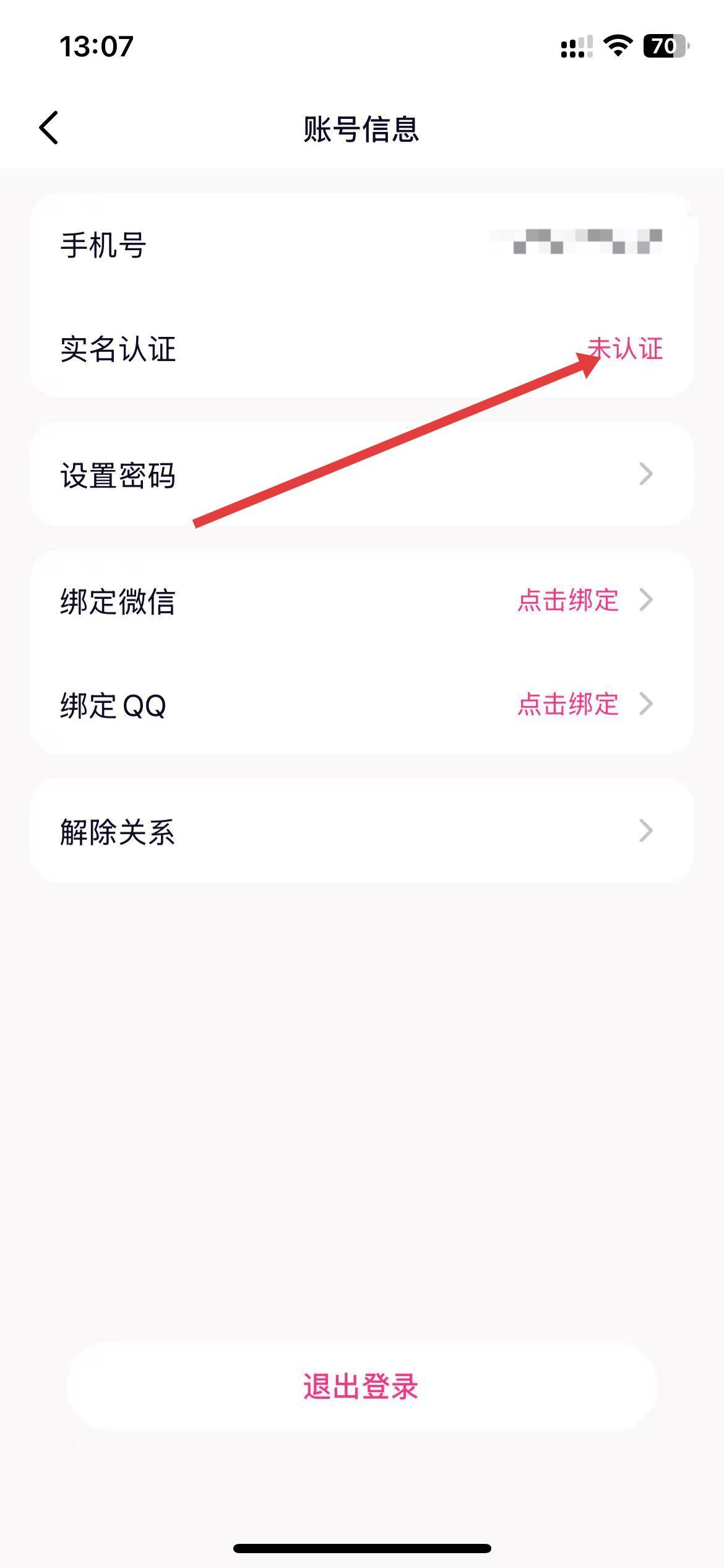 3、找到标注实名认证的选项,点击未认证的提示字样,全部操作完成后即可完成实名认证。