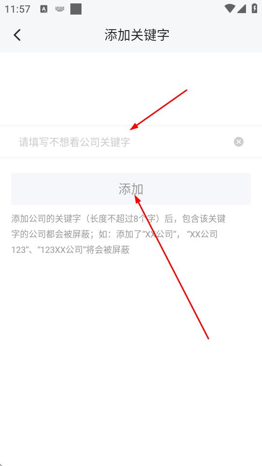 5、在添加关键字页面,输入不想看的公司关键字,点击添加,即可完成对相关公司的屏蔽。