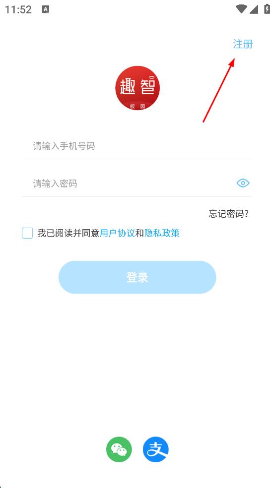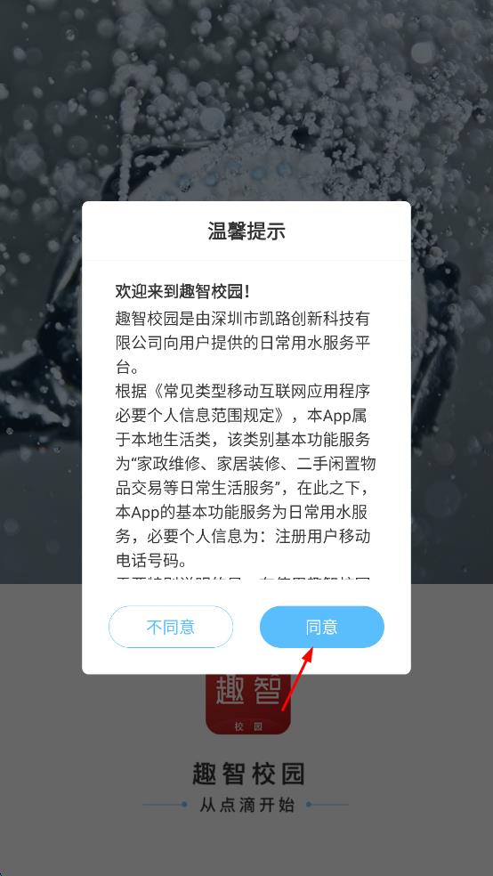 1、打开趣智校园APP,在弹出的“温馨提示”窗口中,点击“同意”按钮。