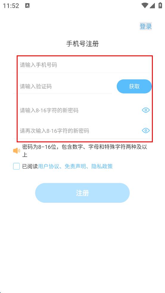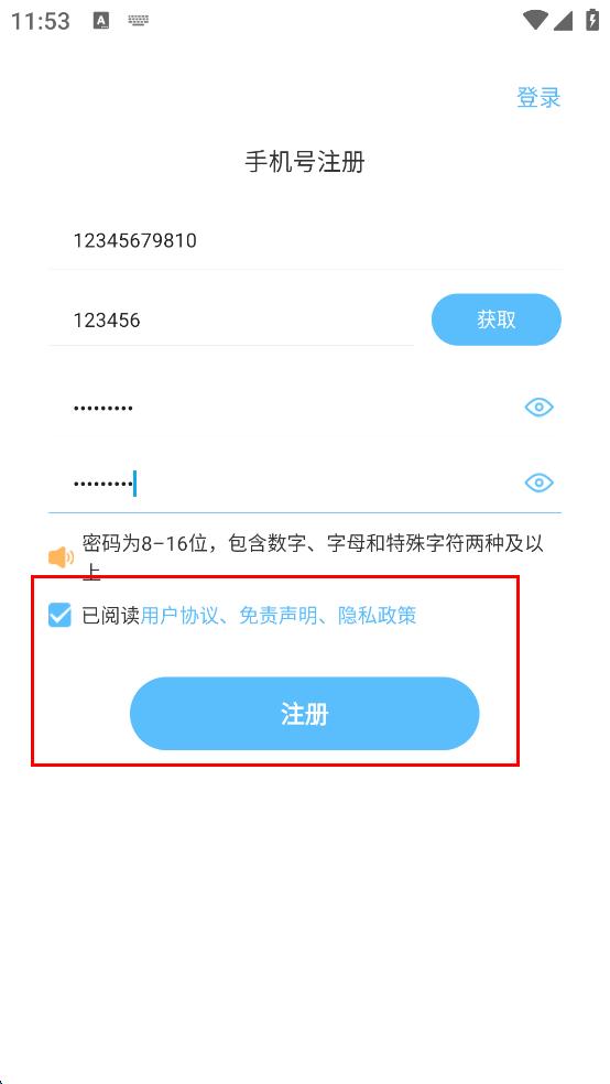 4、勾选“已阅读用户协议、免责声明、隐私政策”,然后点击蓝色的“注册”按钮。