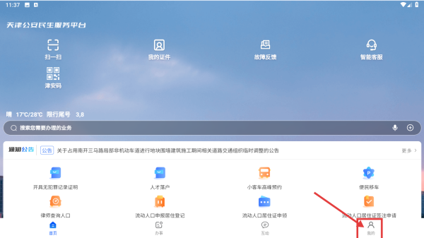 1、打开天津公安民生服务平台APP,点击底部我的选项,进入个人中心页面。