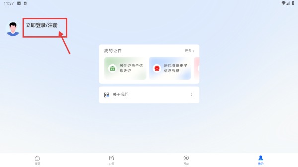 2、在个人中心,点击立即登录/注册区域,进入登录选择界面。