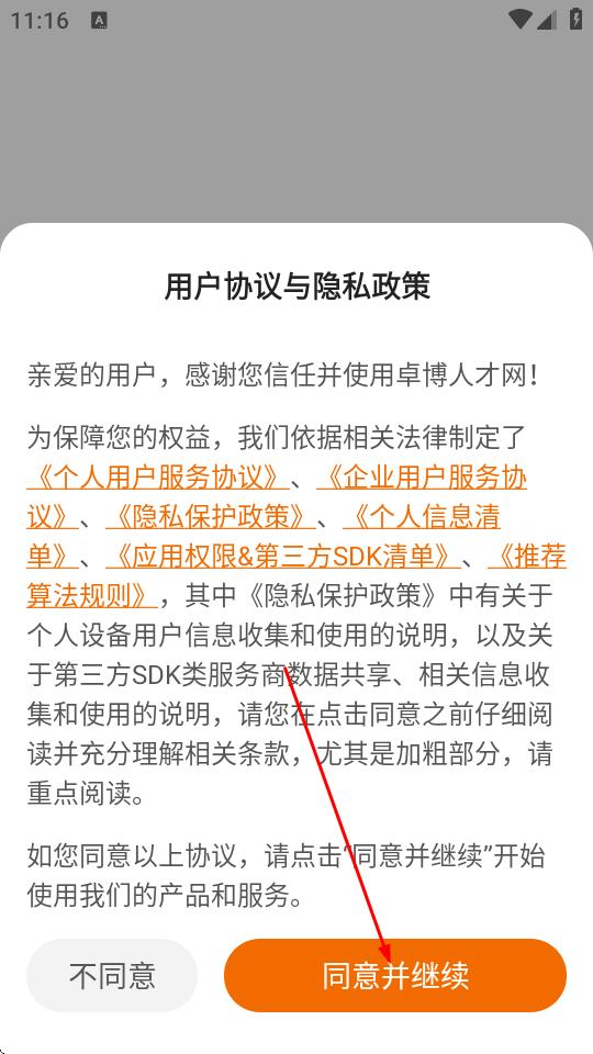1、打开卓博人才网APP,在弹出的用户协议与隐私政策页面,点击同意并继续。