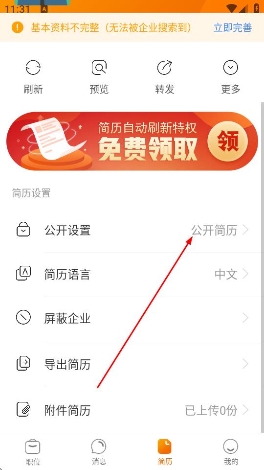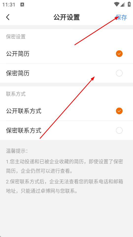 4、在公开设置页面,选择保密简历,点击保存,即可关闭简历公开。