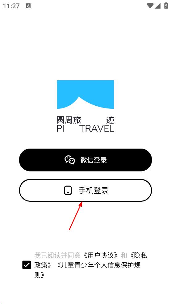 1、打开圆周旅迹APP,在登录页面,点击“手机登录”按钮。