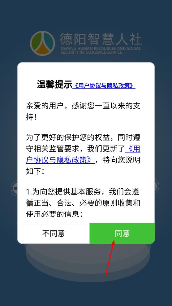 1、打开德阳智慧人社App,在温馨提示页面,点击“同意”按钮。