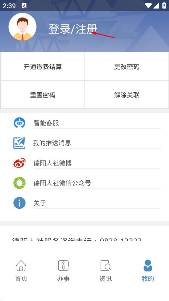 3、在“我的”页面,点击“登录/注册”,进入社保账号登录页面,输入身份证号码/电话号码。