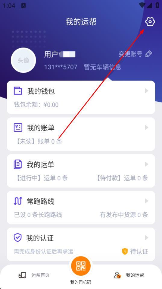 2、在我的运帮页面,点击右上角的设置图标。