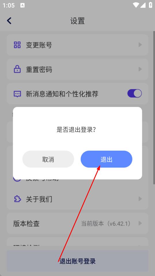 4、在弹出的是否退出登录提示框中,点击退出,即可完成账号退出登录操作。
