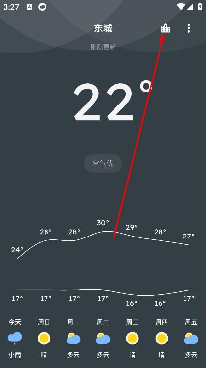 如果不喜欢自带的主题,还可以选择自己喜欢的主题。打开 Pure 天气,首页展示的是城市、温度、空气质量和一周天气预报。这基本上就是一款天气应用所要包含的基本要素了