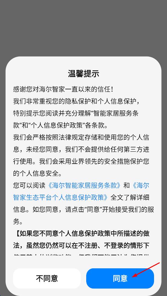 1、打开海尔智家APP,出现温馨提示页面,仔细查看后点击“同意”按钮。