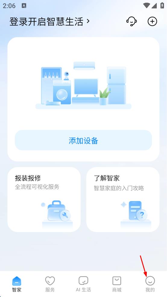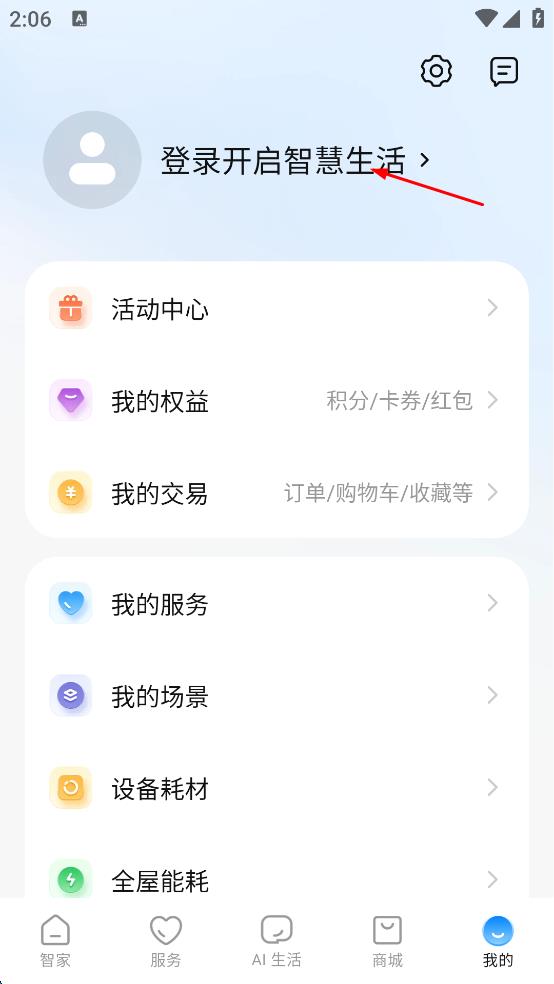 3、在“我的”页面,点击“登录开启智慧生活”选项,进入登录界面。