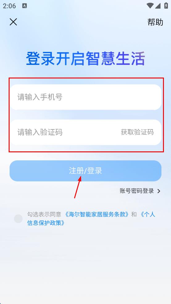 4、在登录界面,输入手机号,点击“获取验证码”并输入验证码,最后点击“注册/登录”按钮。