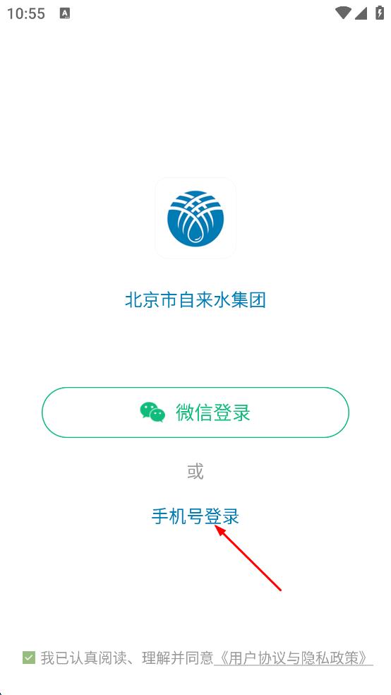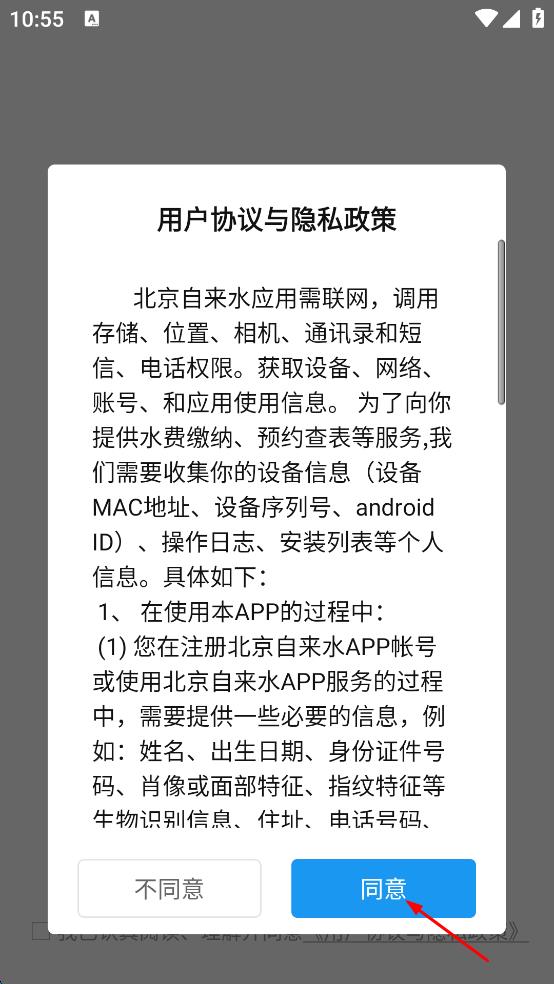 1、打开北京自来水APP,出现用户协议与隐私政策页面,仔细查看后点击“同意”按钮。