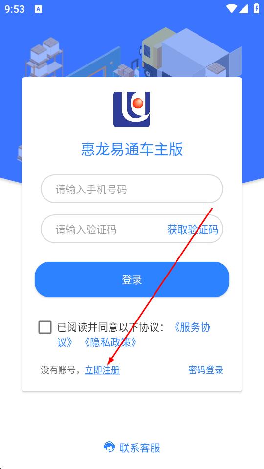 1、打开惠龙易通车主版APP,在服务协议和隐私政策页面,点击同意。