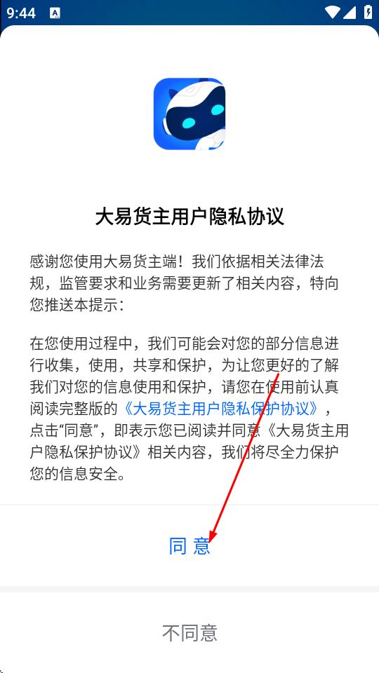 1、打开大易货主APP,在大易货主用户隐私协议页面,点击同意。