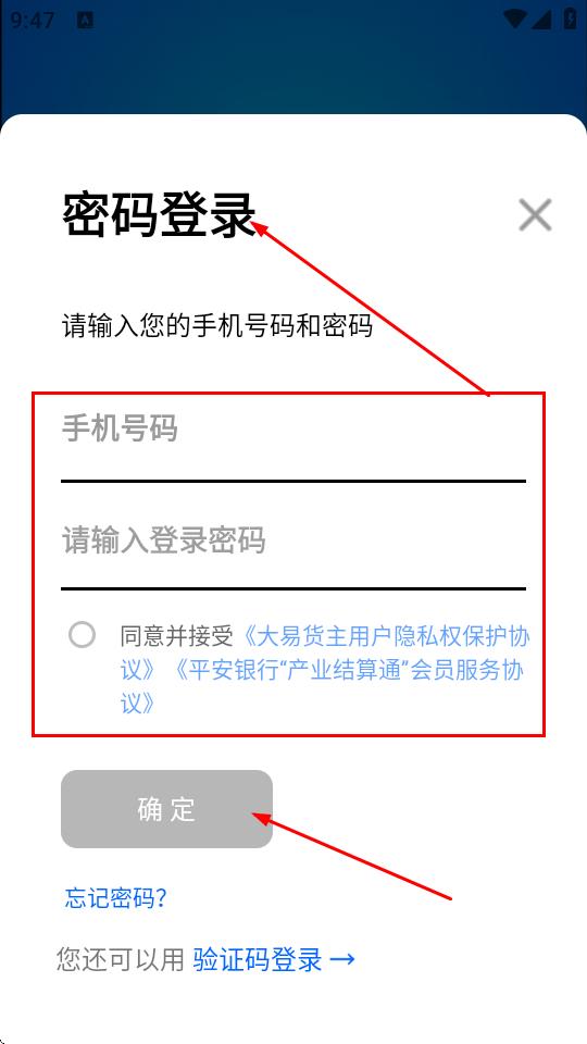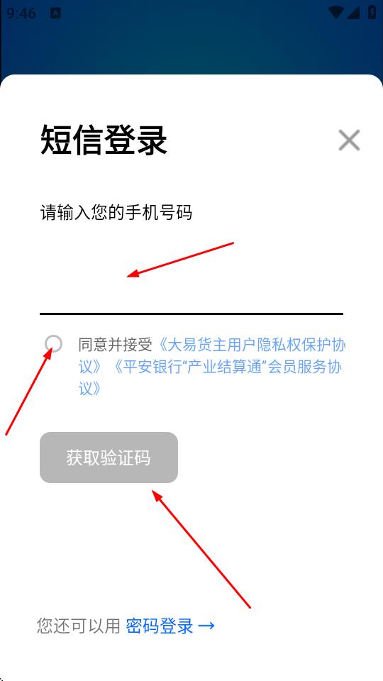 3、选择短信登录,输入手机号码,勾选同意并接受大易货主用户隐私权保护协议平安银行产业结算通会员服务协议,点击获取验证码,进行登录。