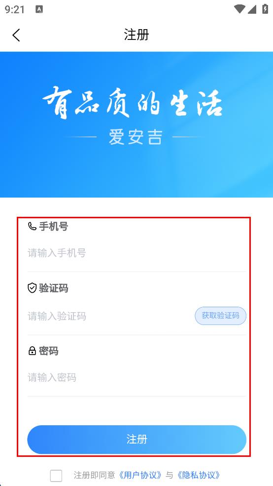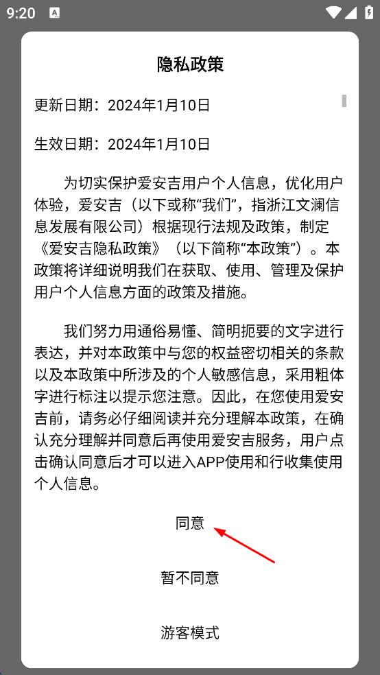 1、打开爱安吉APP,进入后会出现隐私政策页面,仔细查看后点击“同意”按钮。