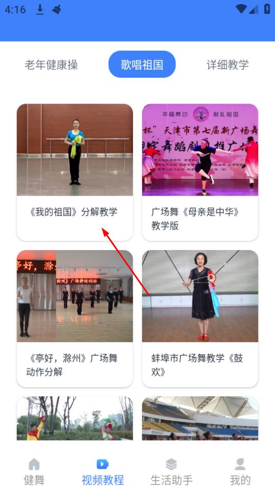 1、进入精彩广场舞,点击视频教程入口即可进入视频学习页面。