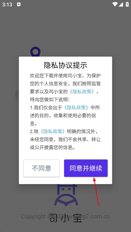 1、打开司小宝App,在隐私协议提示页面,点击“同意并继续”按钮。