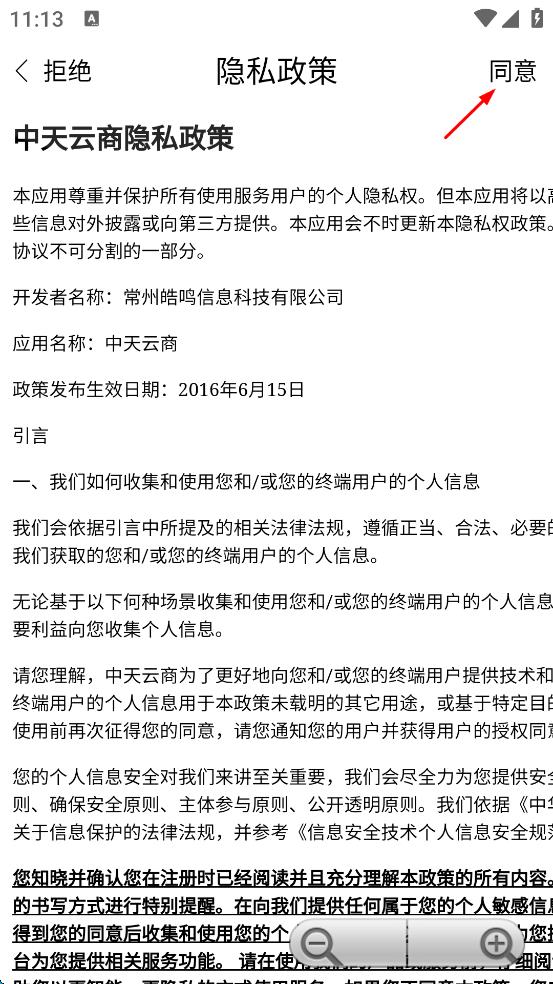 1、打开中天云商,会出现隐私政策界面,仔细阅读后点击“同意”,进入使用手机号登录页面。