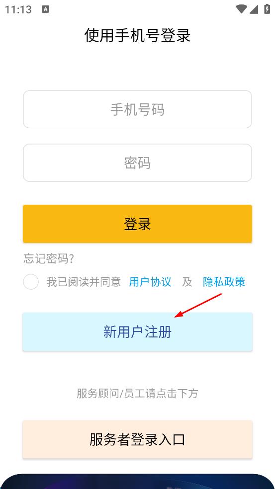 2、在使用手机号登录页面,点击“新用户注册”,弹出身份选择界面。