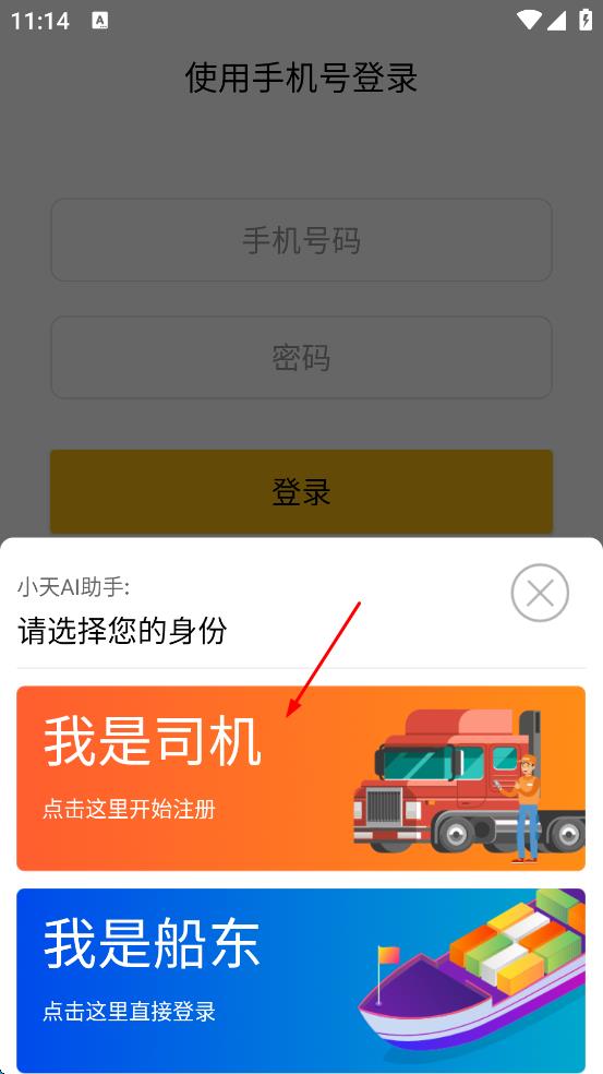 3、在身份选择界面,选择“我是司机”,进入注册司机新用户页面。