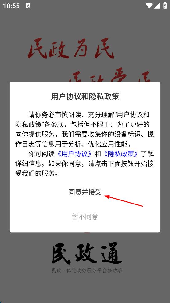 1、打开民政通,会出现用户协议和隐私政策界面,仔细阅读后点击“同意并接受”,进入软件主界面。