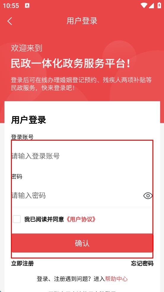 4、在用户登录页面,输入登录账号和密码,勾选已阅读并同意用户协议后,点击“确认”完成登录。