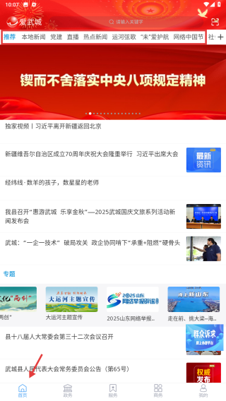 1、打开爱武城应用,在首页查看本地新闻、直播等种类。