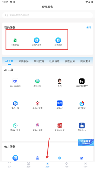 3、在服务页面当中,有手机充值、天然气缴费等。
