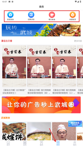 4、在商务页面当中点击家庭家装、招聘求职等种类。