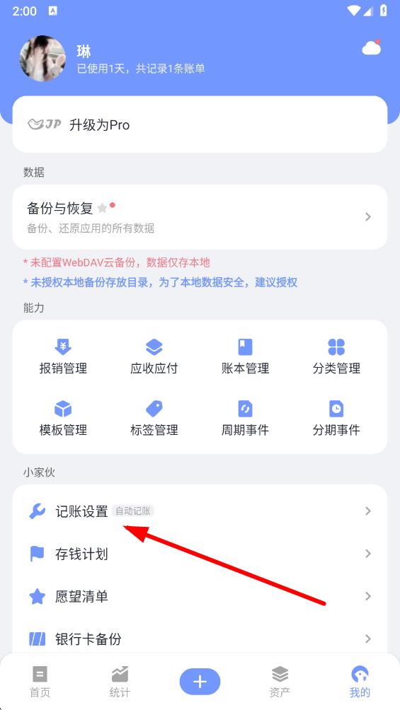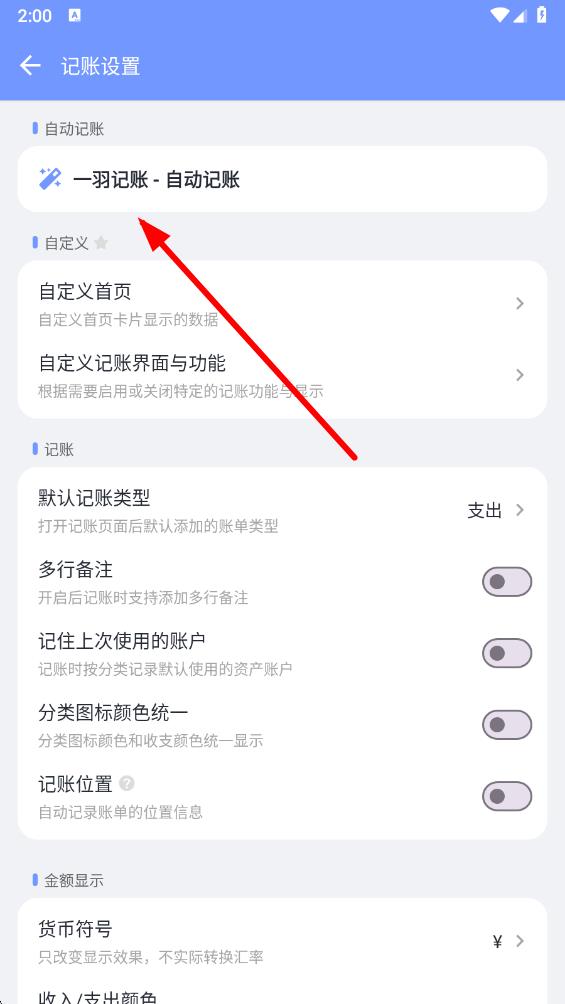 3、进入记账设置页面后,点击一羽记账自动记账选项。