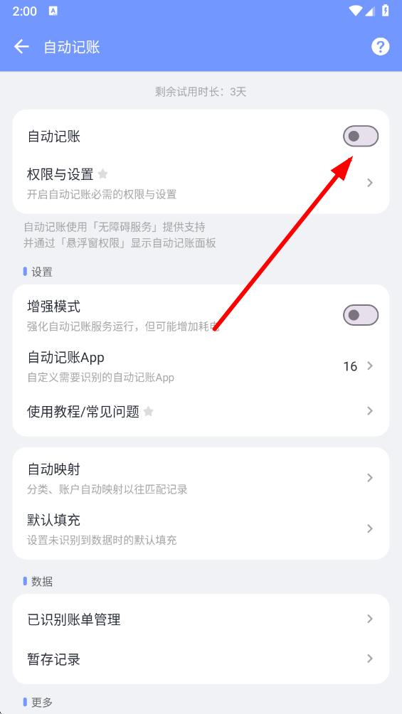 4、在自动记账页面,点击自动记账右侧的开关按钮将其开启,根据提示完成权限设置等相关操作,即可启用自动记账功能。