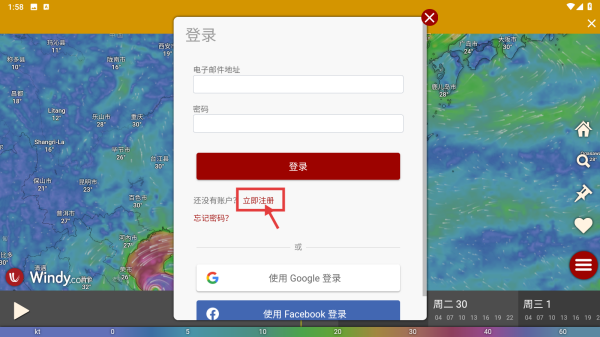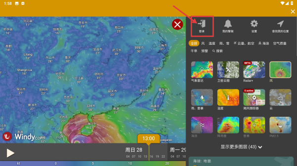 1、打开Windy气象应用,点击右侧菜单按钮,展开功能选项。