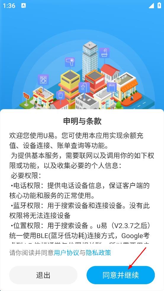 1、打开U易APP,出现申明与条款界面,仔细阅读后点击“同意并继续”,进入登录选择页面。