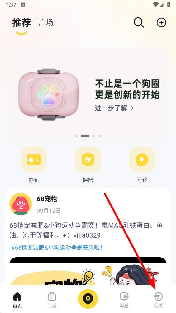 1、打开68宠物app,点击底部导航栏中的我的选项。