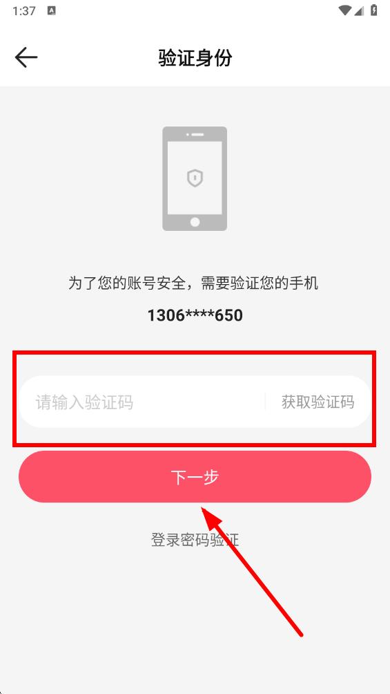 5、接着在验证身份页面点击获取验证码,输入收到的验证码后点击下一步,然后按照提示完成新手机号的绑定。